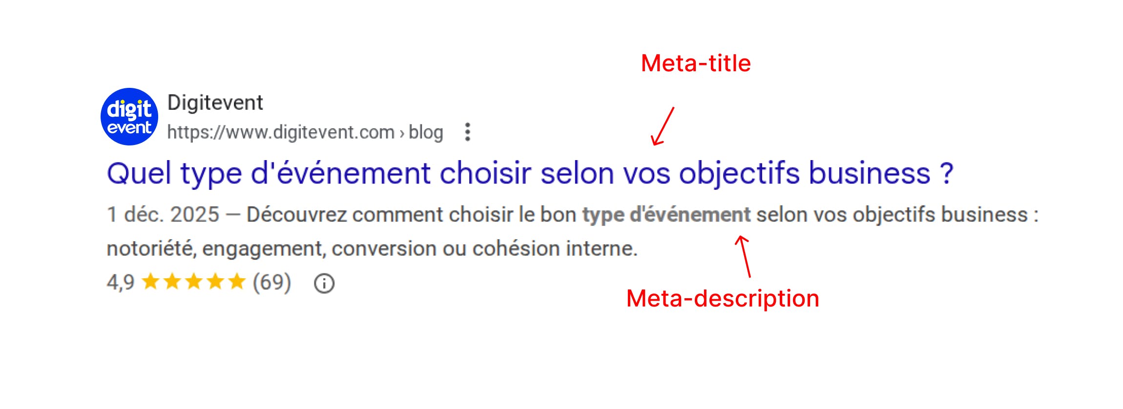 En effet, les moteurs de recherche ne lisent pas uniquement le corps des pages de votre site Internet événementiel, mais aussi les informations présentes dans le code HTML qui se trouve derrière.